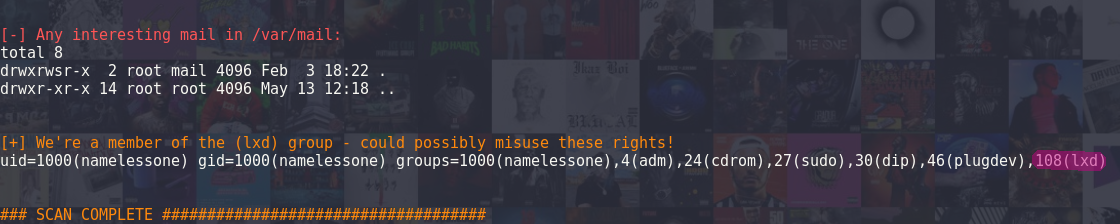 As usual I got stuck on privilege escalation for a while. After running linpeas.sh and LinEnum.sh going through kernel exploits, sudo etc... I found something peculiar the current user is part of a group called lxd.