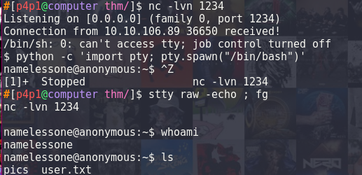 This time around I decided to do a really quick nmap to start going somewhere because I really didn't want to wait for a full nmap. A few day's ago I met up with a friend and we where talking about FTP and that he had to login to a box with the "Anonymous" username on FTP. So logically seeing ftp open I had to try it out :), now looking back at this the room of the name is also anonymous so it's kind of obvious what the creator is hinting at.