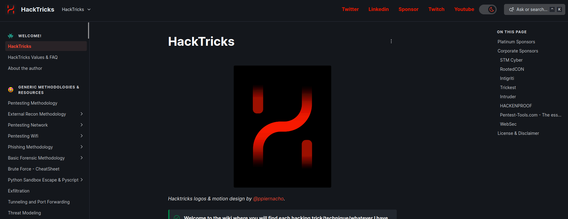 The lord the all mighty hacktricks and website of the equivalents are like the ultimate checklists for penetration testers and I think they are great tools for people to use in a pinch but in some corporate environments websites like hacktricks are blocked behind firewalls since they are "Hacking" websites.