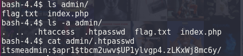 After getting a shell I started looking around the file system and found a admin/ folder in witch there was a .htpasswd with an unknown hash and a username.