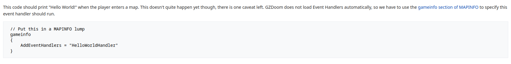 So this specific code is directly ripped from the zdoom wiki and should basically print Hello World on the terminal after a world load. I tried this out for like 30 minutes and I couldn't get it to work for some reason. After going back through the documentation I discovered this line: