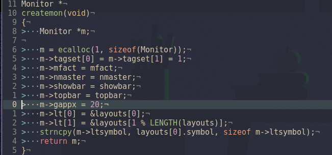So I start simple I first implement the gaps on the top and left side of the window by adding those two " + mon gappx" and then recompile: