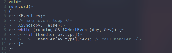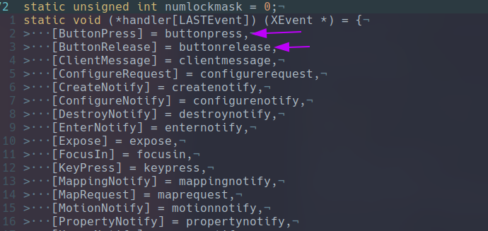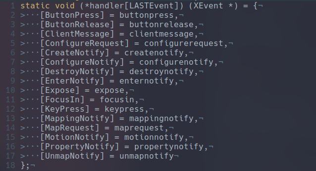 Going through the dwm source code I had a bit of a fan nerd moment. When I was in college I was using arrays of function pointers to simplify the logic of some section of my parsers and discovered that it was also done inside of dwm :)