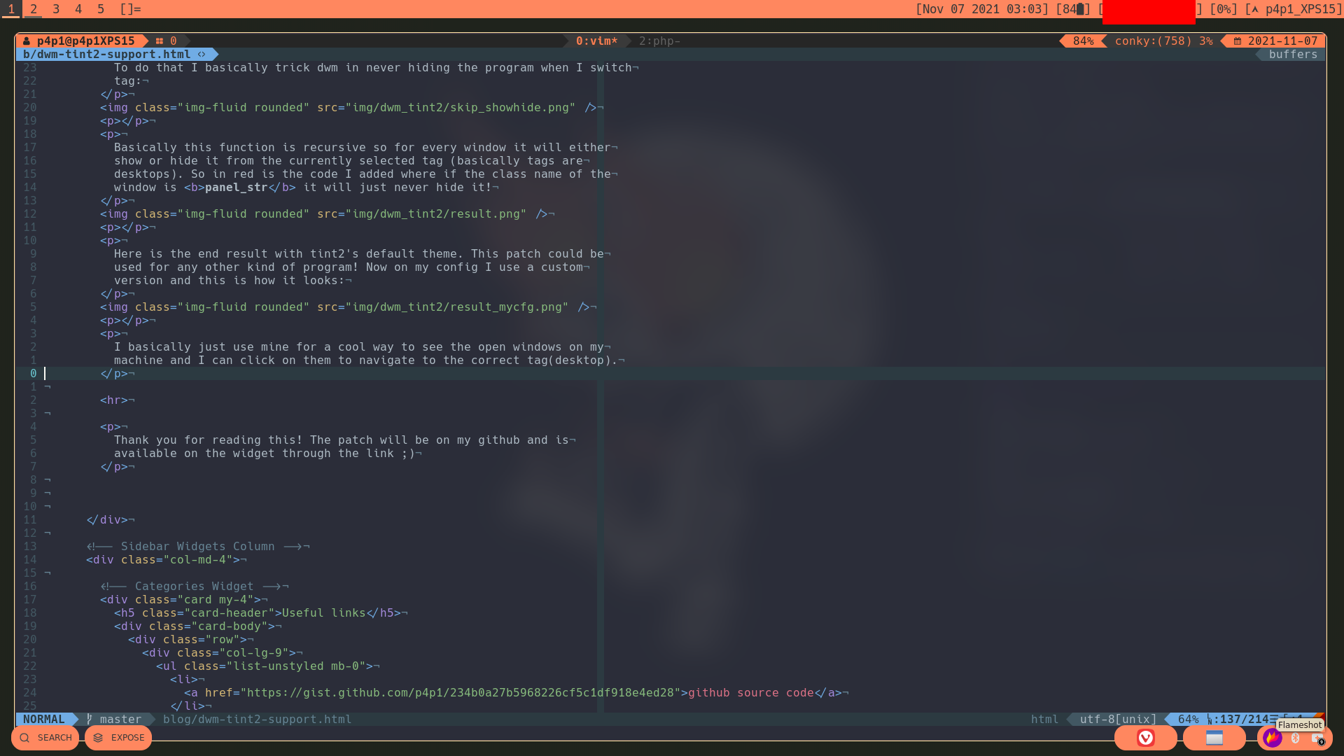 Now currently I have a bug that is a bit hard to fix. I have to be able to skip tint2 in the selection of the window when using the XK_j and XK_k shortcuts. I managed to make it work going up the stack but not going down it. So I will have to fix that one day :D