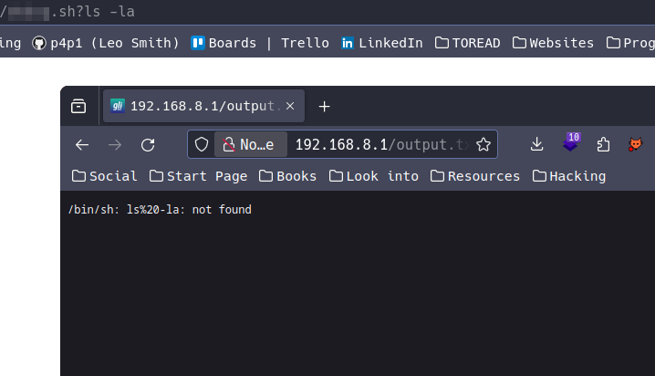 After adding the /bin/sh as a cgi-bin interpreter I can just drop a vulnerable shell script inside of /www/cgi-bin. Since every script in that folder will be executed.