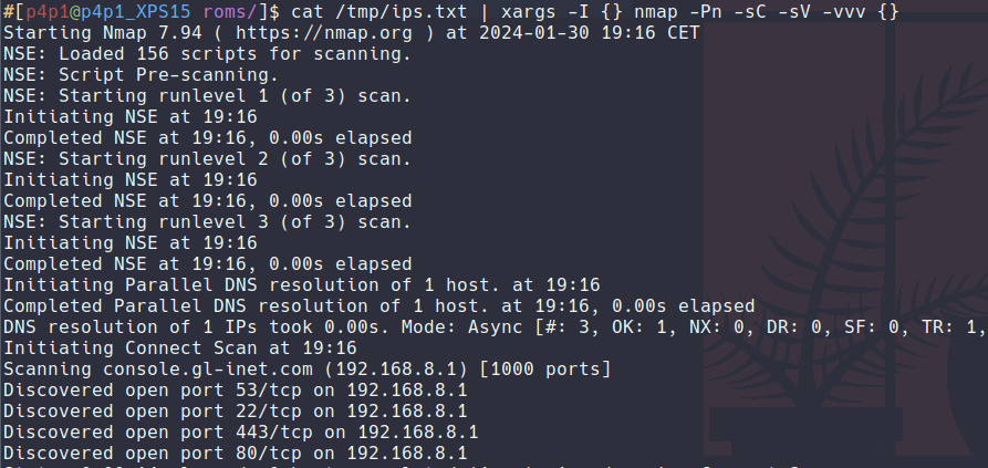 $ cat /tmp/ips.txt | xargs -I {} nmap -Pn -sC -sV -vvv {} -oN nmap_scan_{}