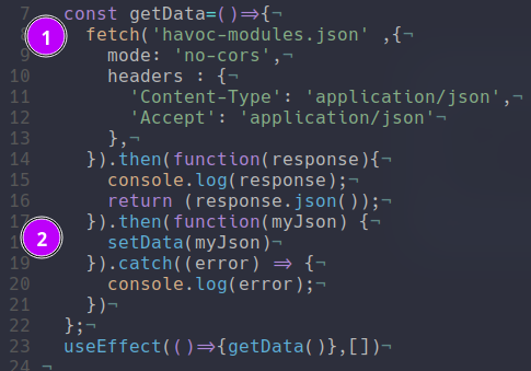 You can see this inside of the source code represented bellow where first we call fetch on havoc-modules.json and then set the data to then be displayed inside of the page:
