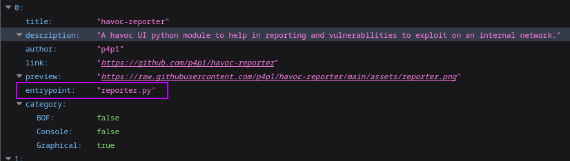From building that website I then got inspired by BurpSuite's Bapp Store and I thought it would be great to have this inside of havoc. So I took my havoc-modules.json and added a entrypoint system. Since the link inside of the json would either be a repo or directly the file in gists I thought it would be great to have it in such a way where inside of the json we could know what file to import inside of havoc and then have havoc download the file and add it to scripts: