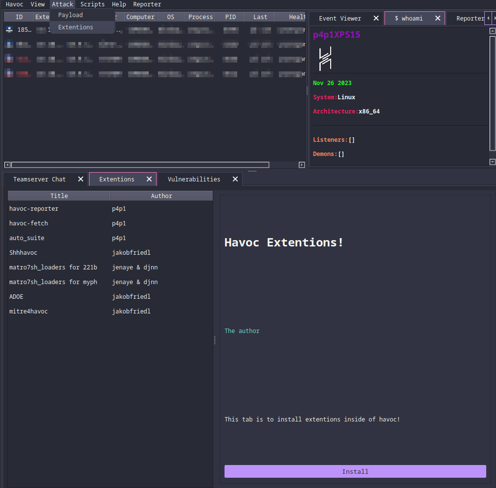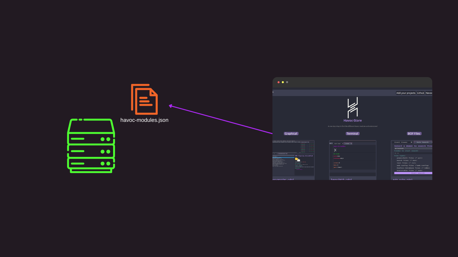In BurpSuite you have the Bapp store and I figured what if havoc had the same a little tab where you can see a little list of extensions and download them directly on your machine. I also wanted a web page a bit like vimcolors where you can view the different modules that havoc supports and mess round with them (test out / view on github).