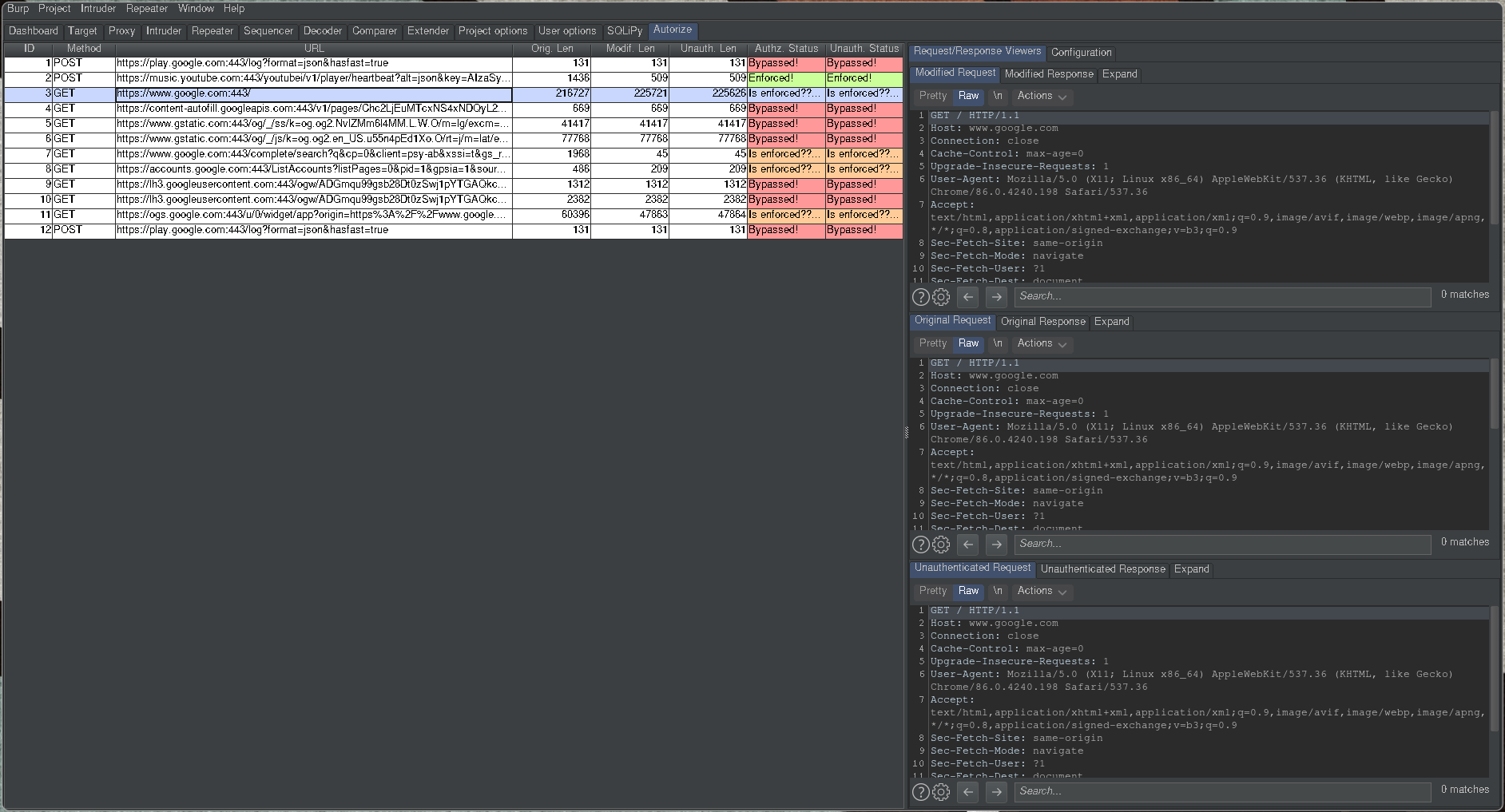 To the right of each request you can see colored boxes, those boxes are what is going to notify you of an IDOR if there is one. In green or Enforced means that the application is returning something totally different for each requests. The orange status or Is enforced?? is when the result is a little different the server didn't return a 401 error code and sent something but the result is different from the original request, for those one you might need to investigate a lot further to find IDORS. The last status that your will see is the red one or Bypassed! those request are the ones when the result is the same as the original one, in some cases this is good news :)