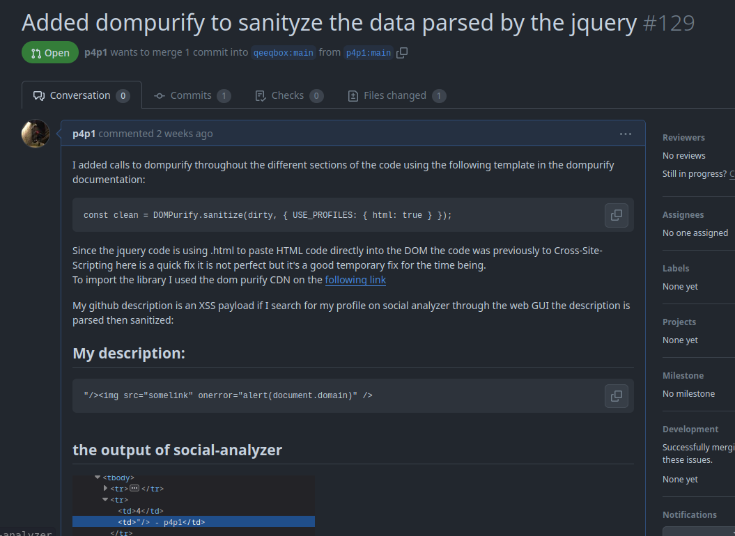 So with this I just straight up modified the code myself with DOM purify and did a PR because why not: