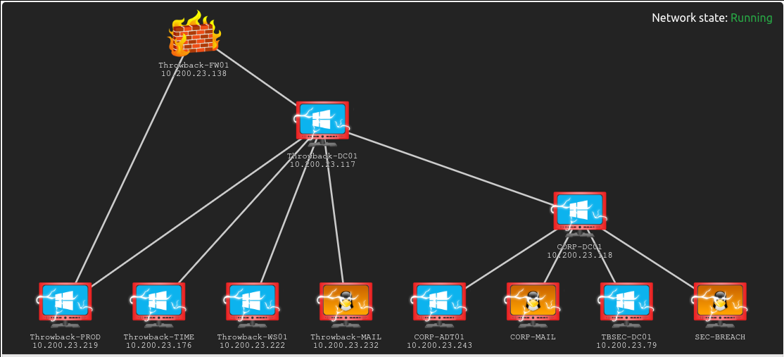 So I recently completed the tryhackme network named throwback. It was awesome! I personally hate windows pentesting and I have been avoiding it since I started so this room was a great opportunity for me! I recommend anyone to try it, it was worth every penny (Yes it's a paid room). To quickly explain the concept you have a windows network to hack with 2 computers open to the network and the rest is all internal to the Active Directory network. This writeup will be a little different instead of explaining all of the different steps I took, I will just explain how I exploited each machine starting with the first one that you are meant to hack following their instructions.