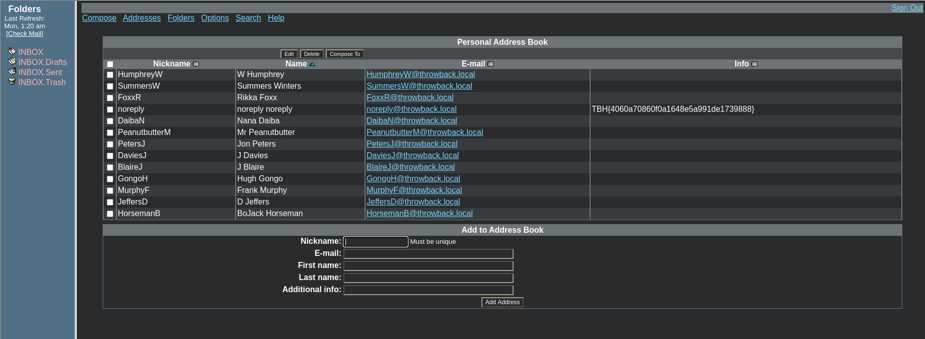 For this box we first had to connect to the email server as all of the users up until I found the one that had an account one the Throwback-TIME server. After clicking on the reset account link we can login to the Throwback-TIME website.