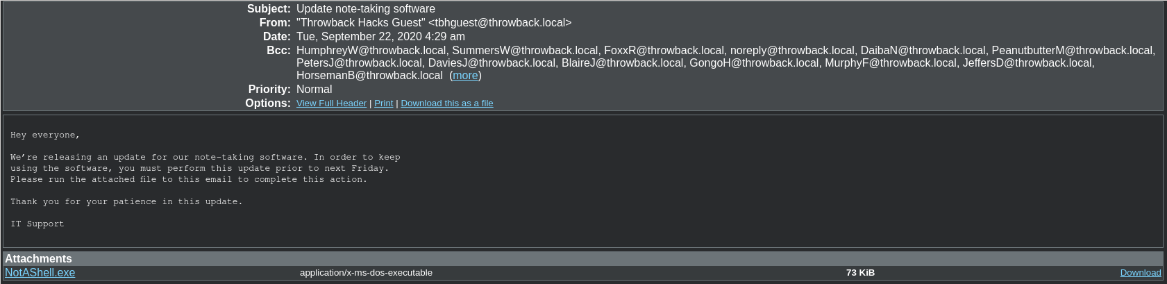 For this box I just had to create a handler on my machine and send an email out to everyone and Throwback-WS01 is always going to hit. The only problem I had was I wasn't patient enough so I got frustrated a lot try over and over again with the same email.
