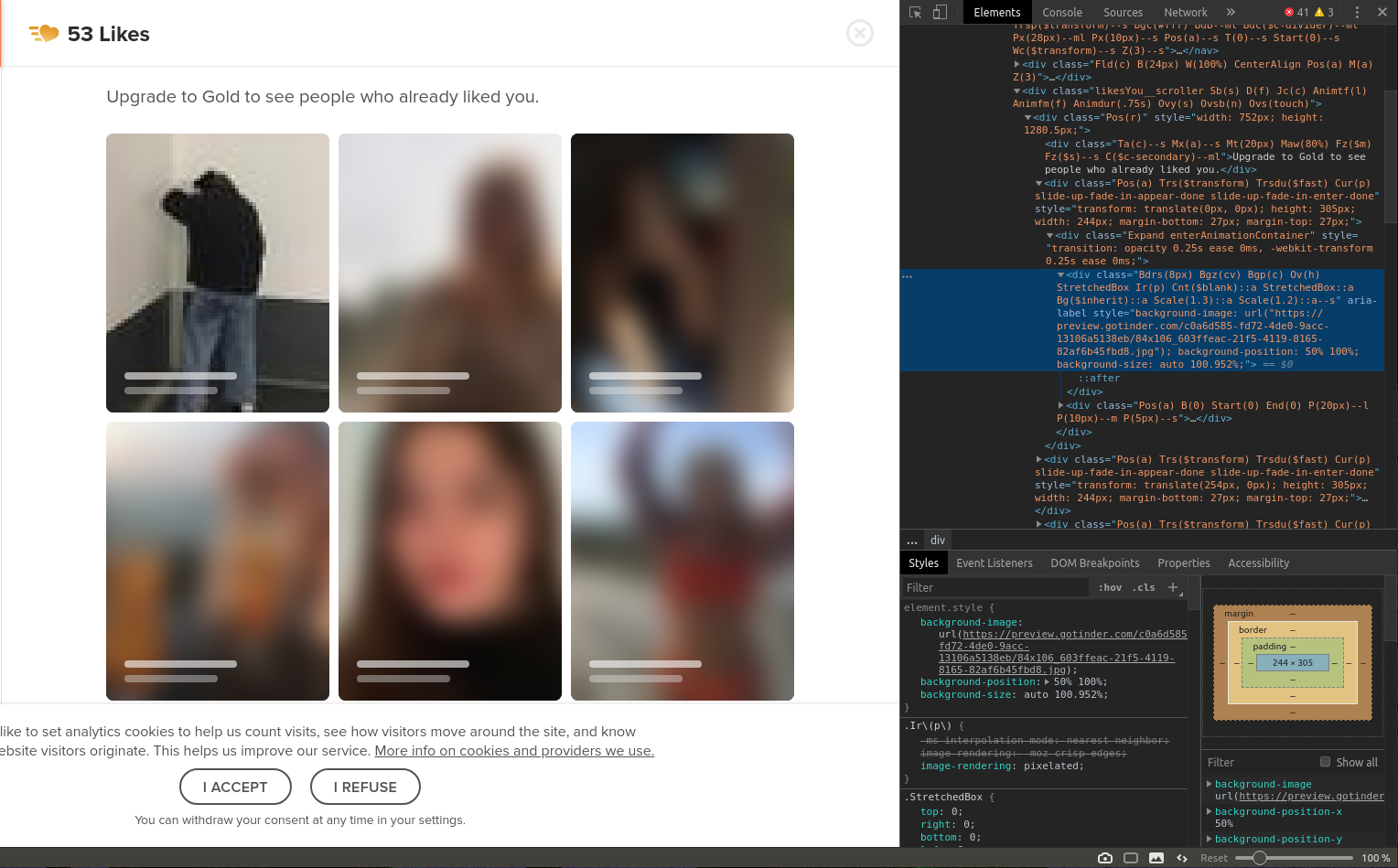 with a bit of quick thinking it was easy to understand why this would exist. Uploading on their server hundreds of photos from each profile with a copy of each photo blurred would take up a shit ton of space on their servers innit. So I jumped on my web browser and started to inspect the "teaser" page, more on why it's called that later.