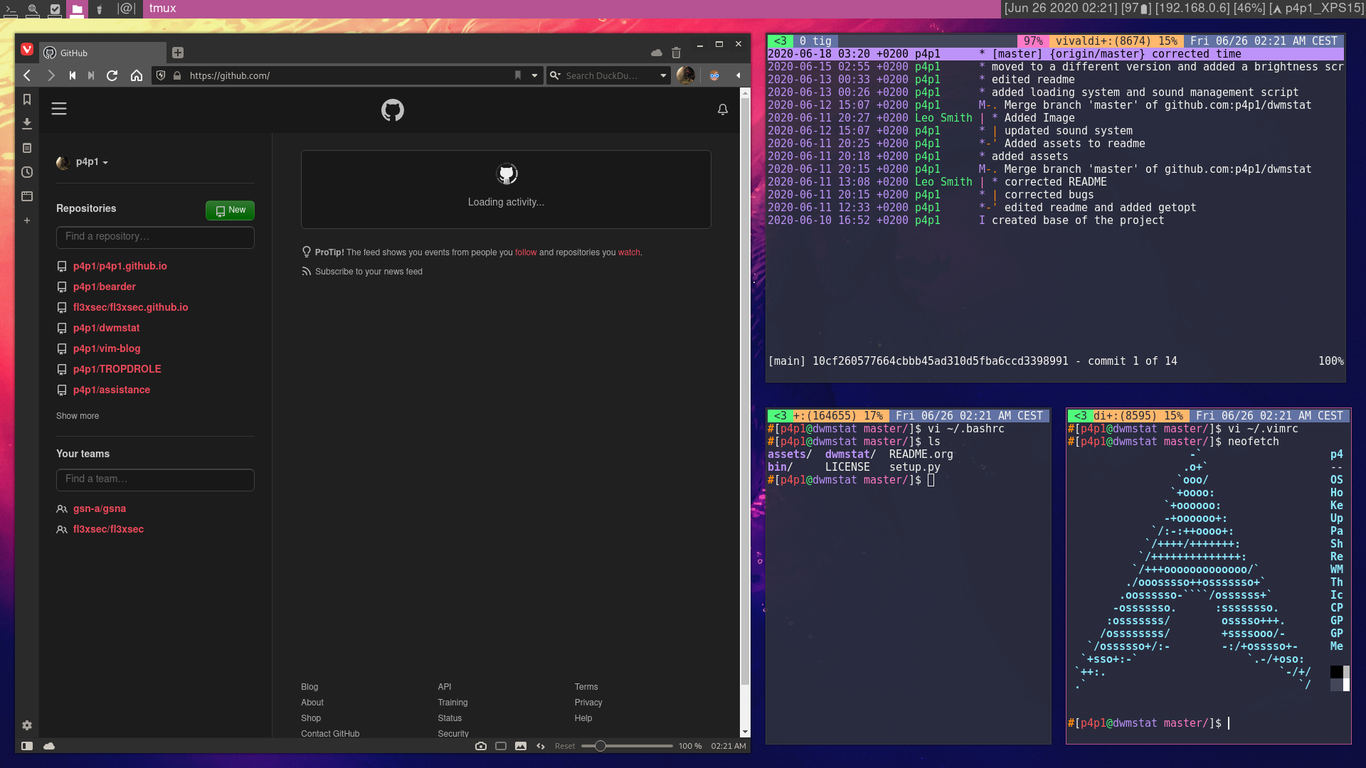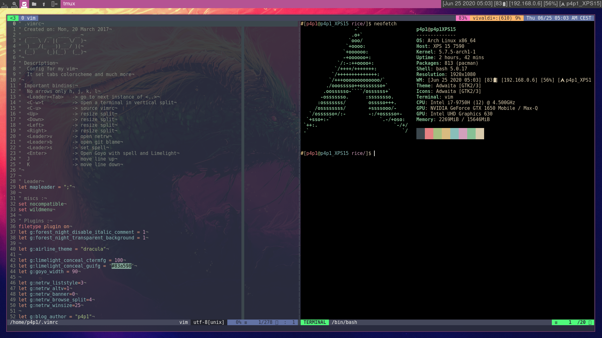 As a terminal I use st I personally use bash ( my bashrc) as a command interpretor and tmux as a multiplexer on my terminal. On those programs I use the Dracula color theme with custom plugins in the status bar.